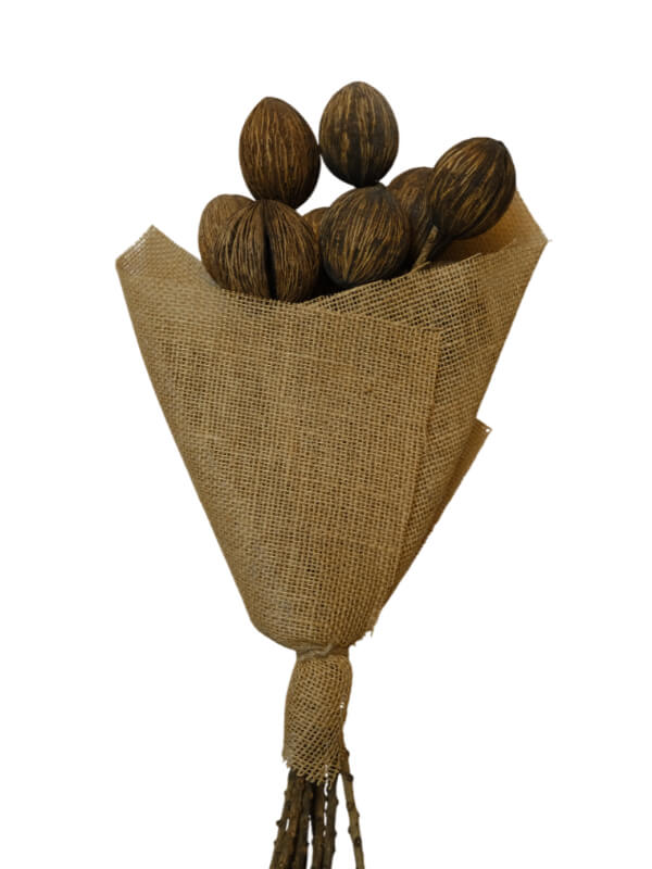 Mintola Ball features hard, woody feel in a natural tone, designed to replicate a tropical seed pod. These real-touch faux mintola balls are sold by the box and trusted by florists, wedding designers, and event professionals for long-lasting arrangements.